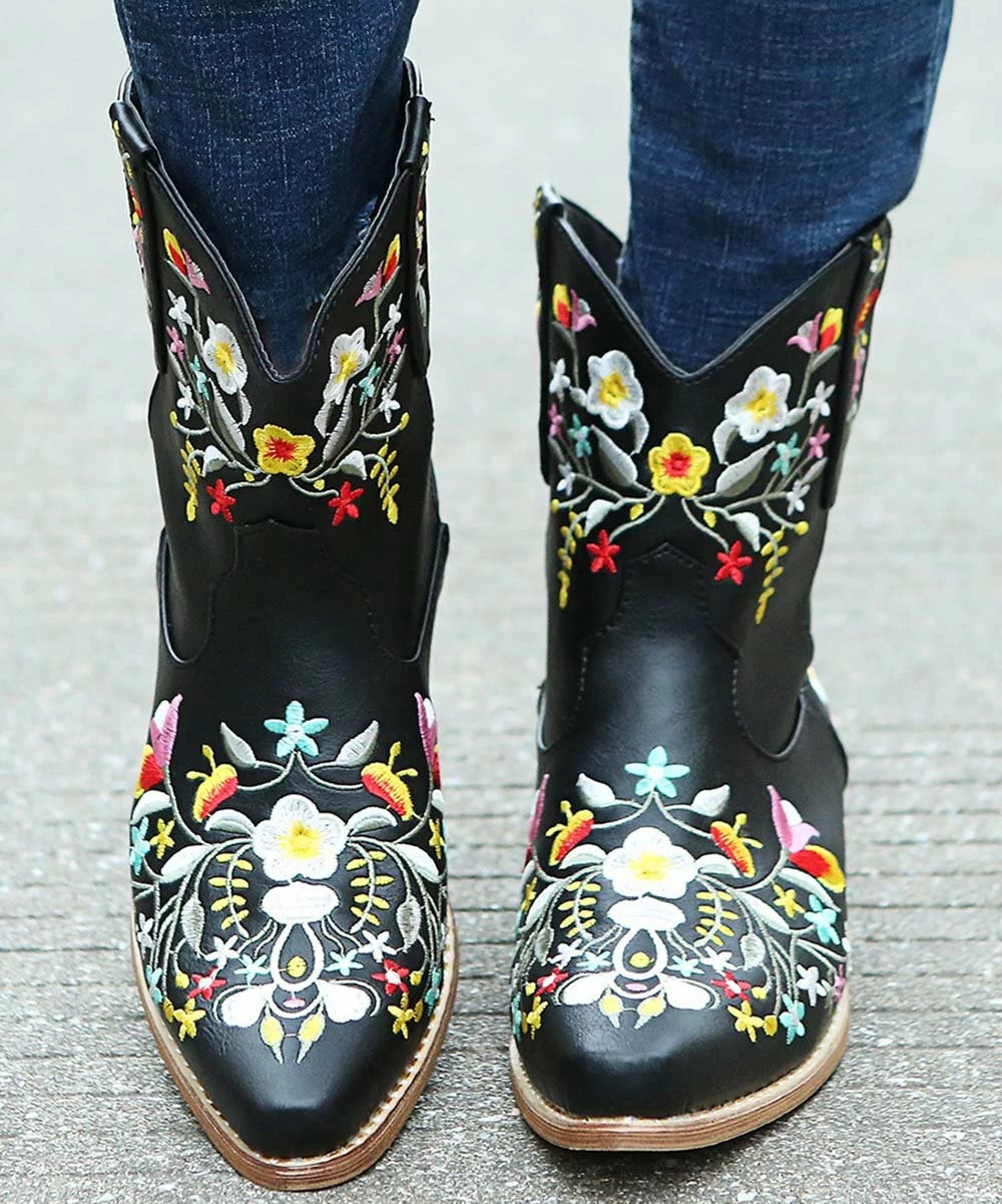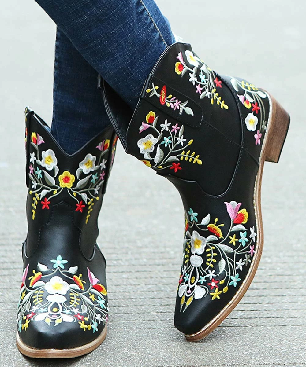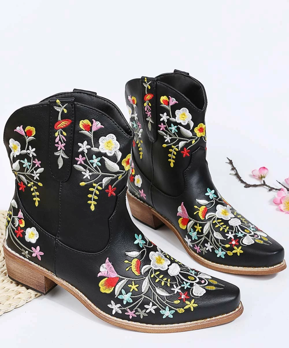 Cowboy boots featuring exquisite floral stitching and a V-shaped curve a the top.