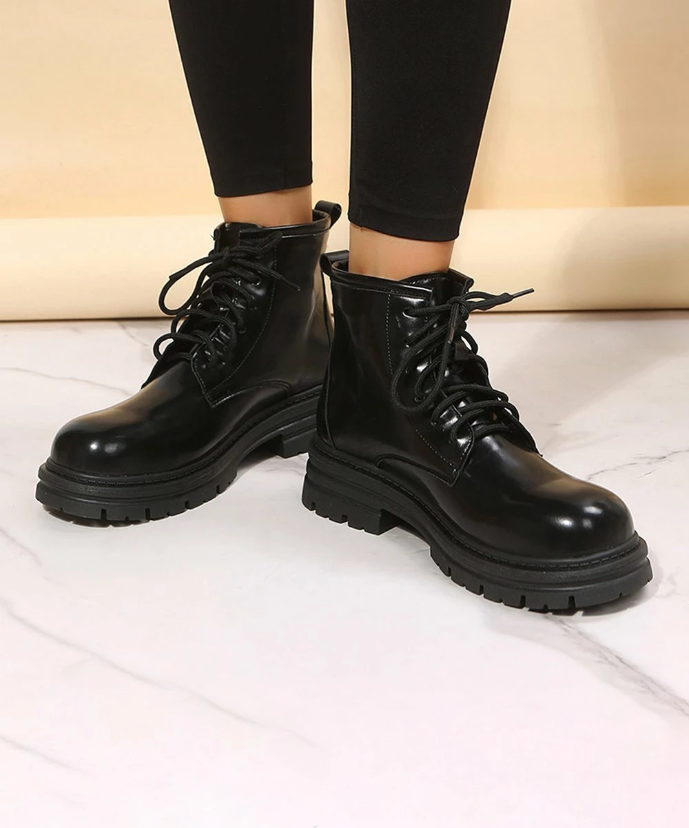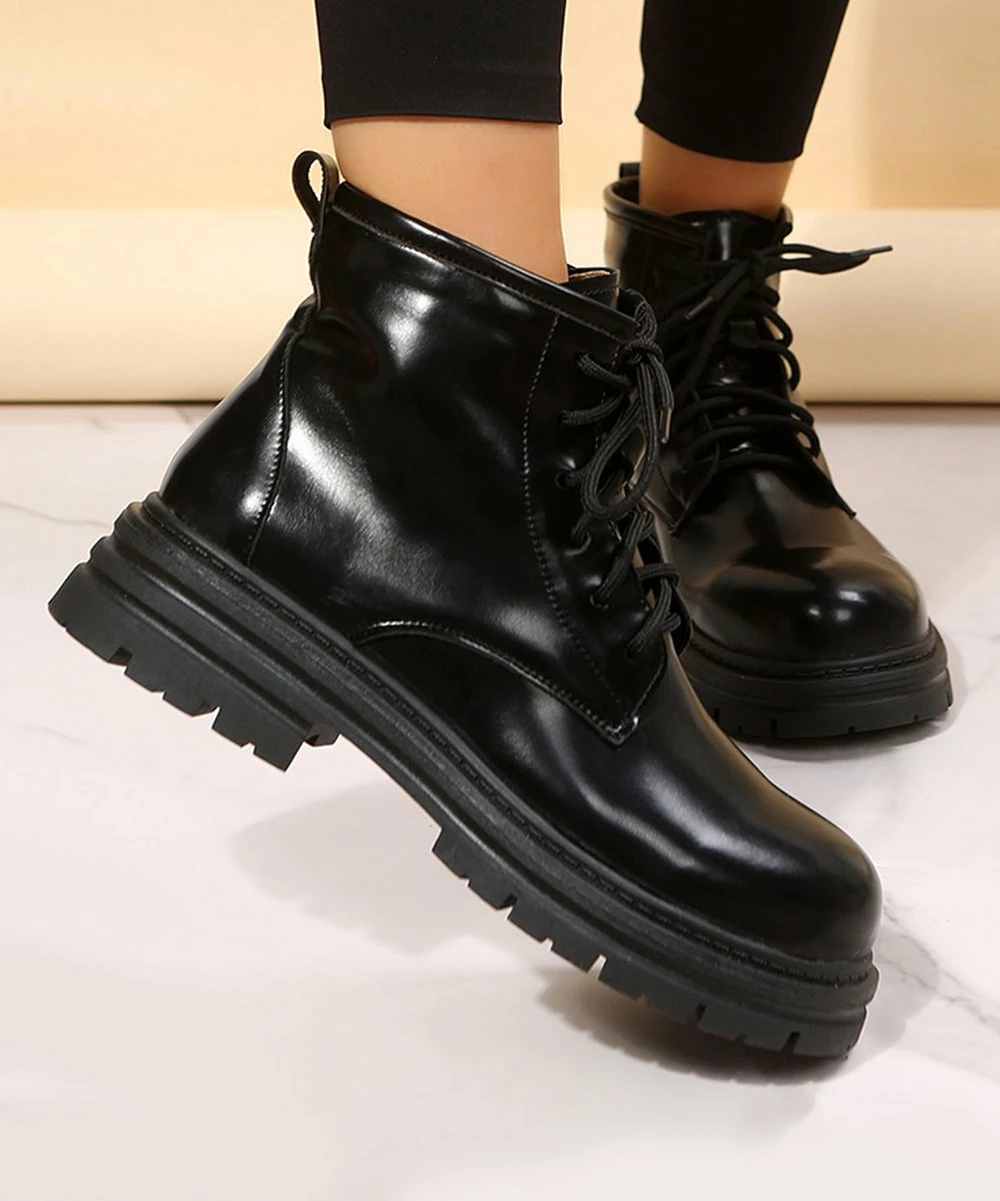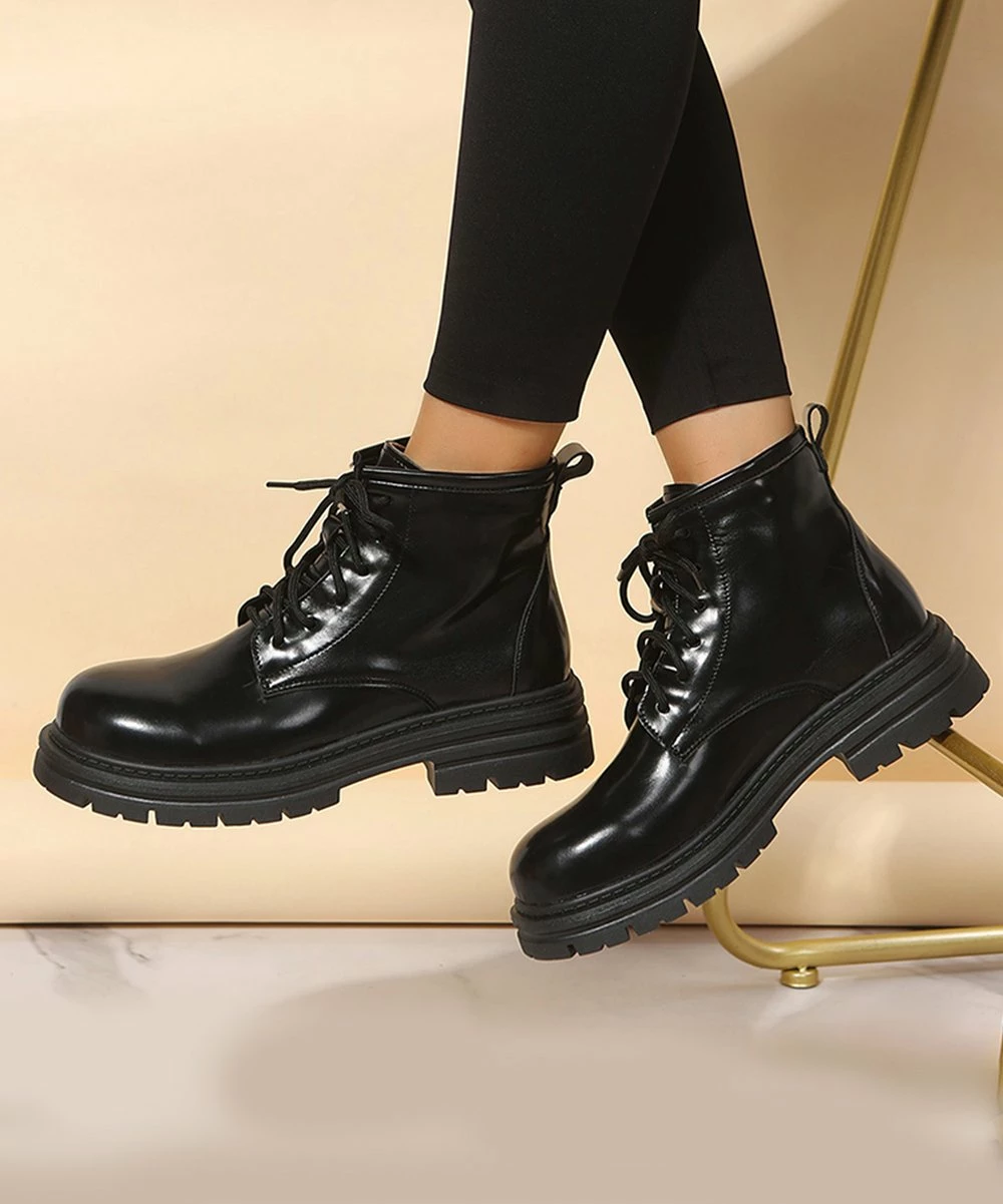 These classic patent combat boots offer a chunky sole and lace closure for an adjustable fit.