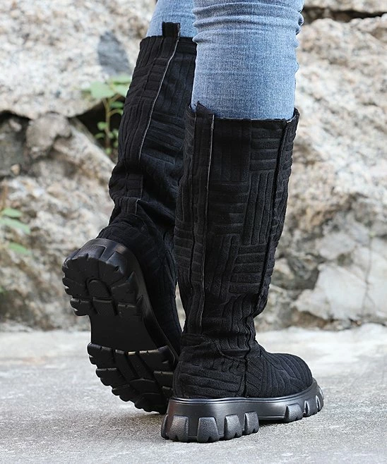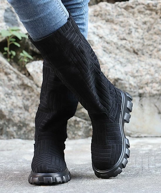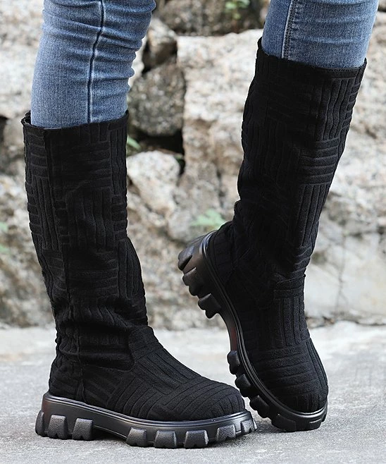 Elevate your casual ensembles with this high boot that features an intricate ribbed design.