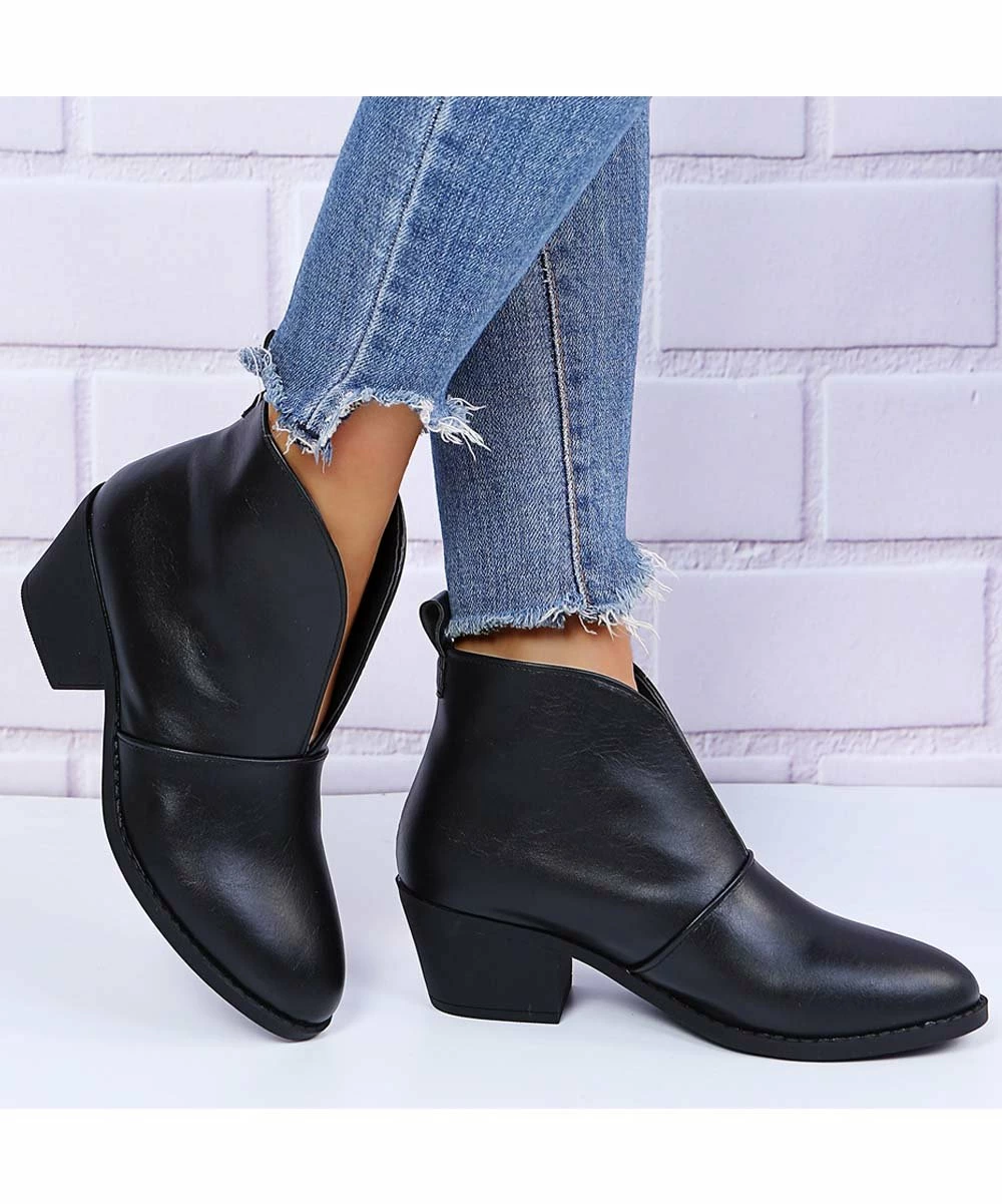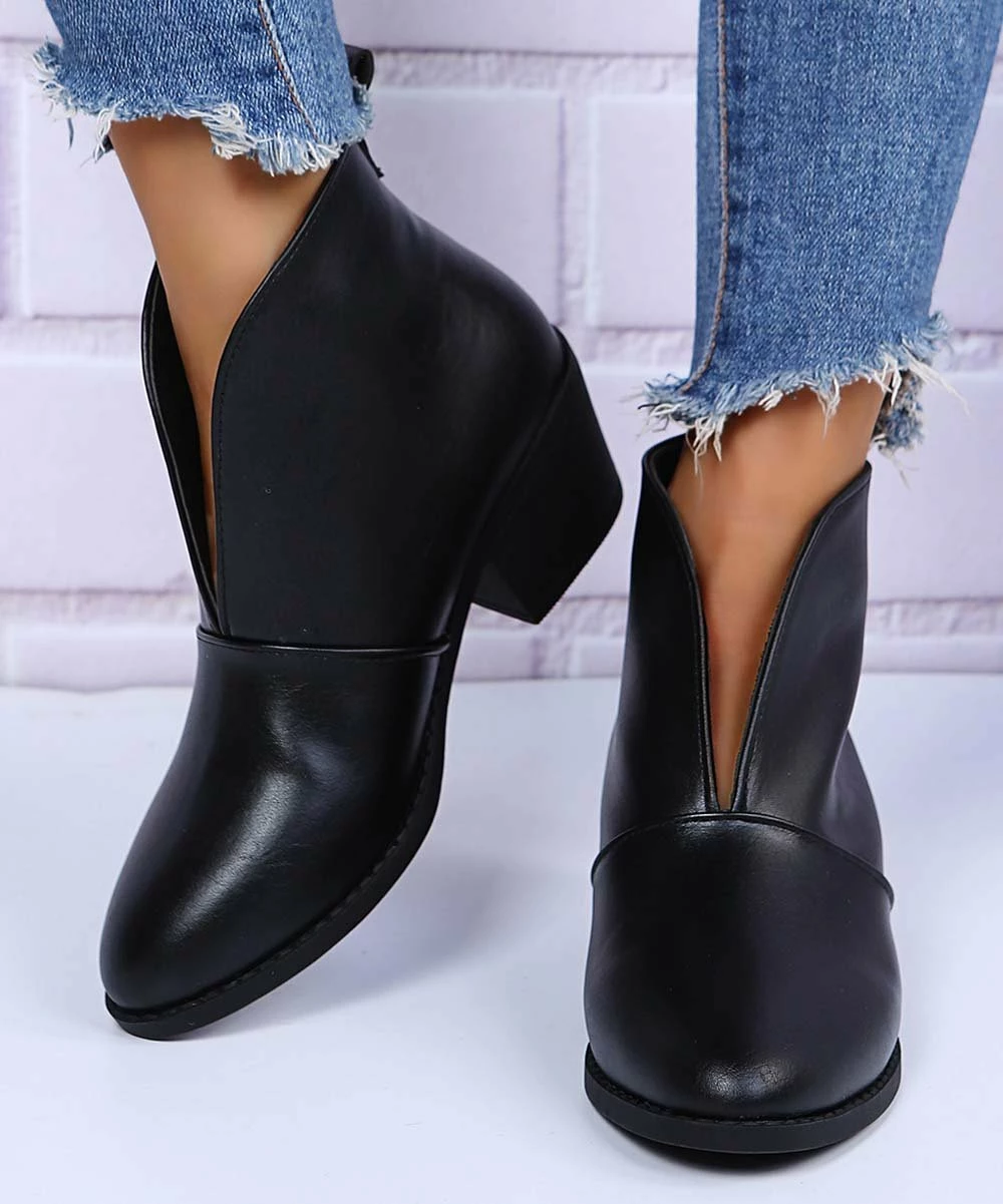 Versatile low-profile ankle boot with a front v-cut slit and a little lift at the heel.