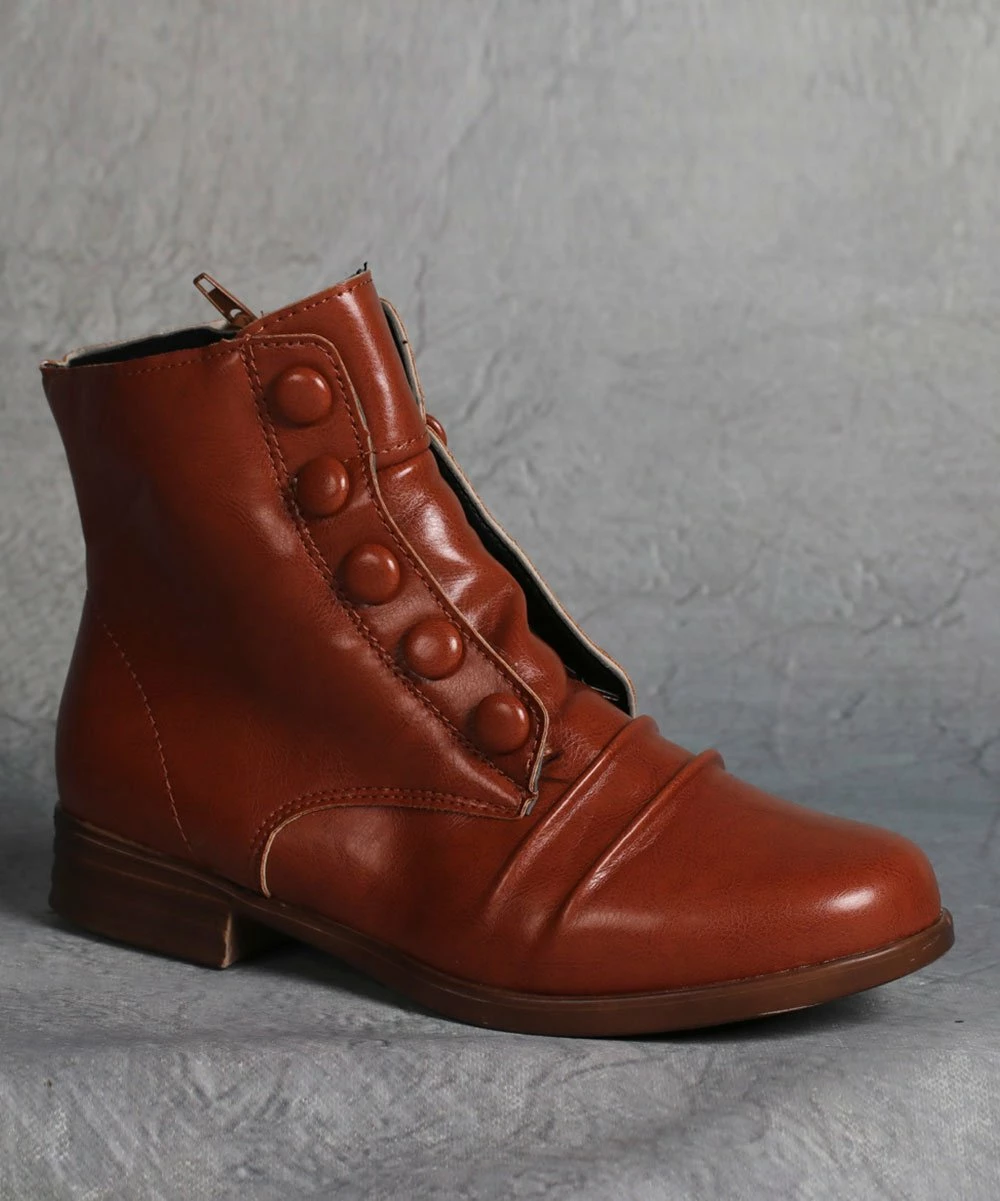 Your casual ensembles can get a style boost when you wear this pair of faux leather boots flaunting unique button accents.