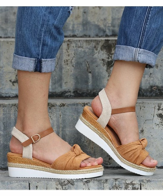 Elevate your steps with this stylish sandal sporting a knotted bow upper with a peep toe and a platform heel.