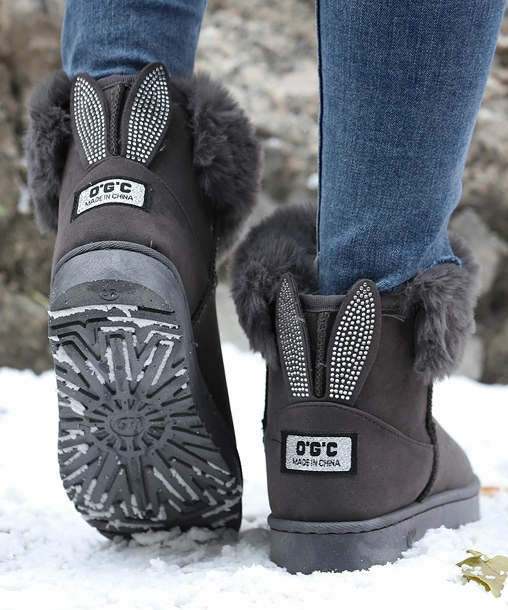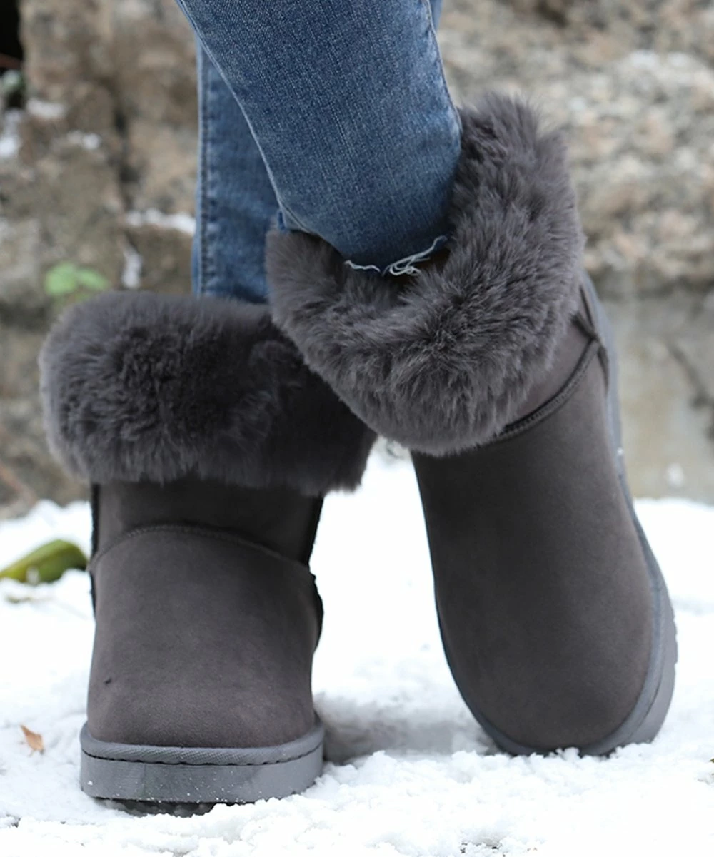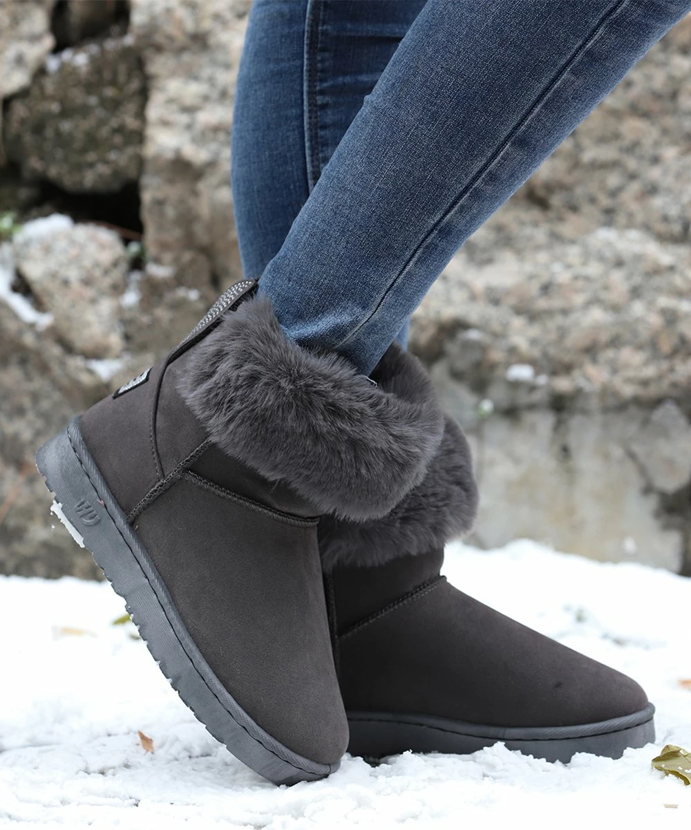 Ankle snow boot featuring a faux fur cuff and lining. Cushioned insole and anti-skid rubber sole.