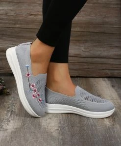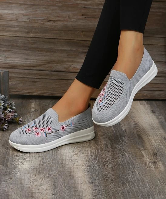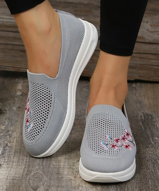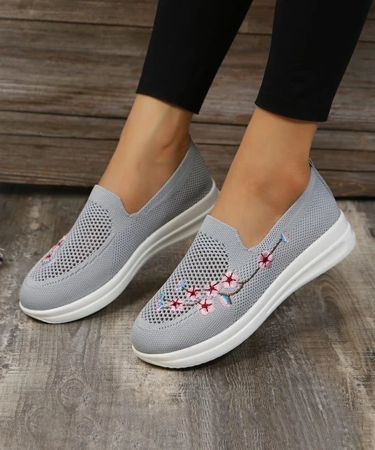 This sneaker features a slip-on design with colorful floral embroidery. Great for days out or casual office environments.