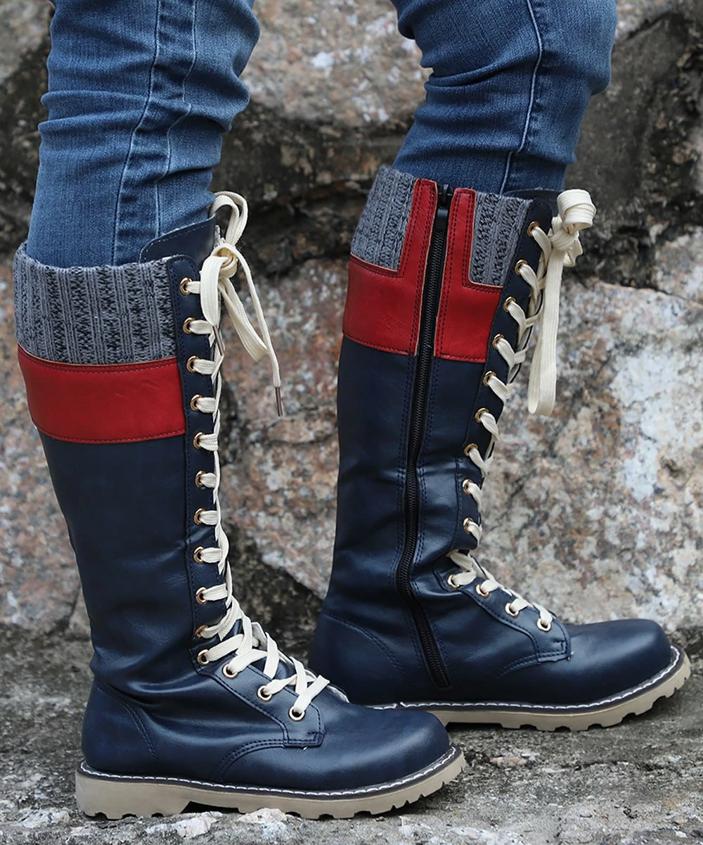 Tall and warm, these stylish riding-style boots are designed with contrasting trim and a decorative lace front for a chic flair during cool-weather days.