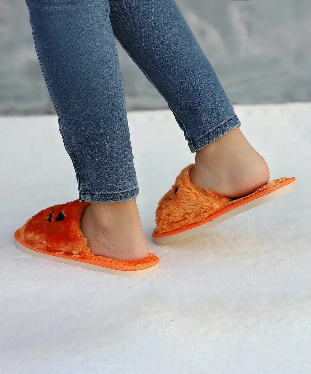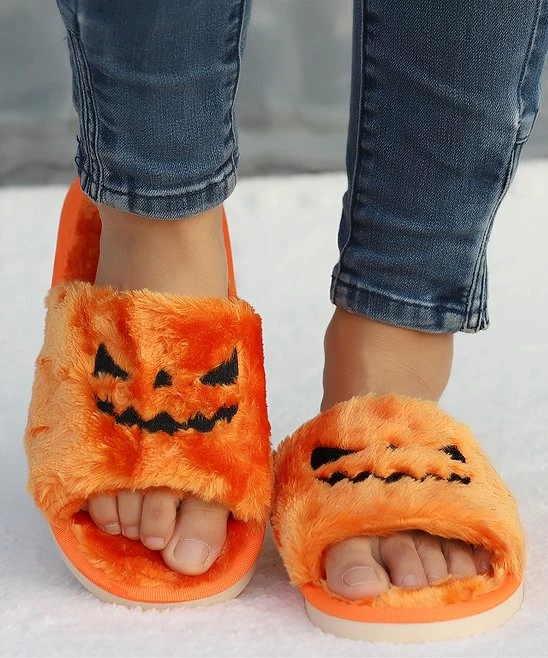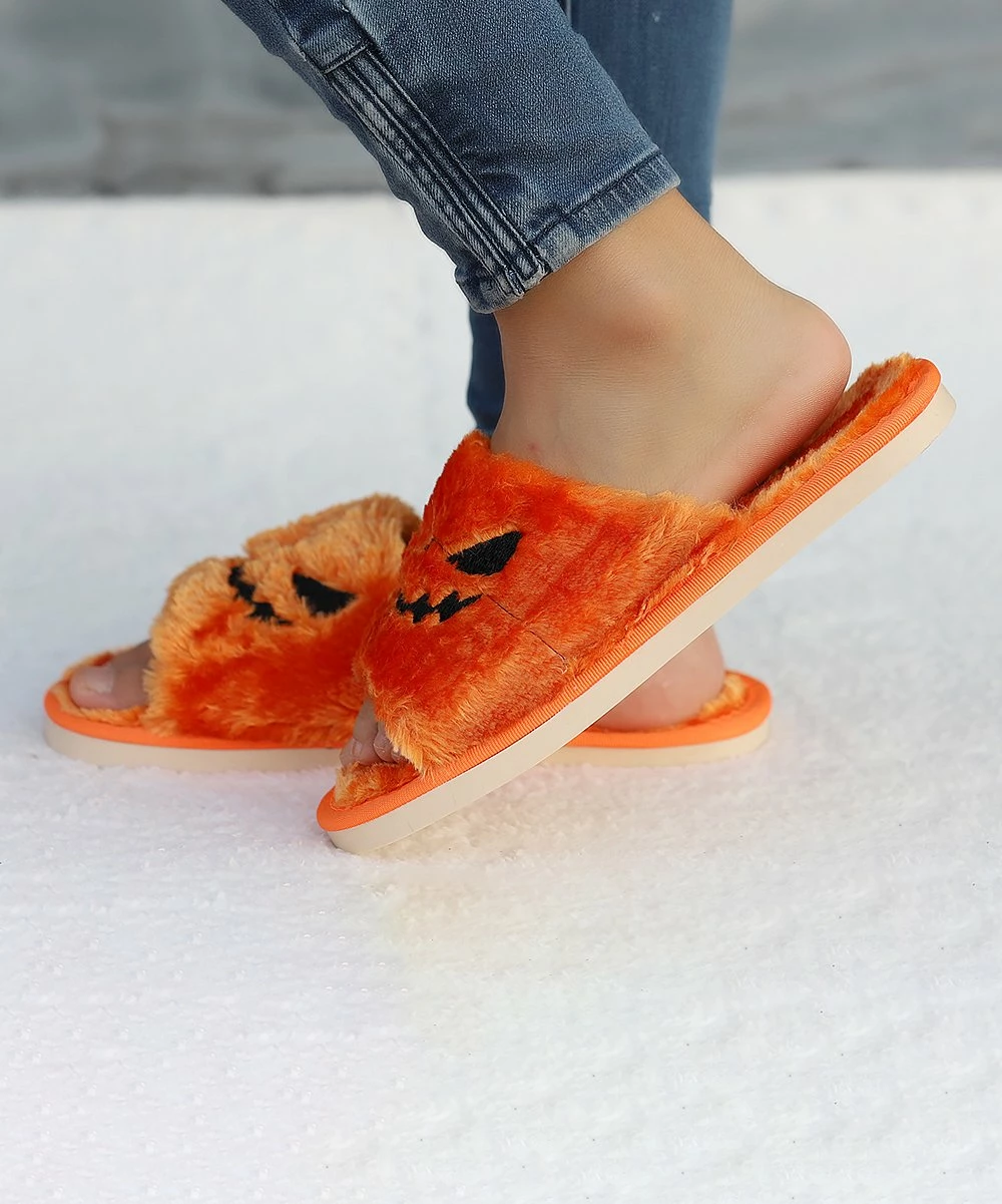Slip into cozy season-right style when you rock these cozy slippers that boast a charming Jack-oโ-lantern inspired design.