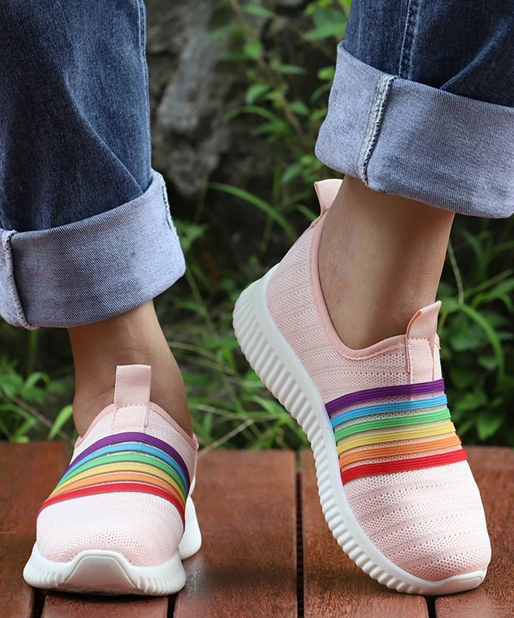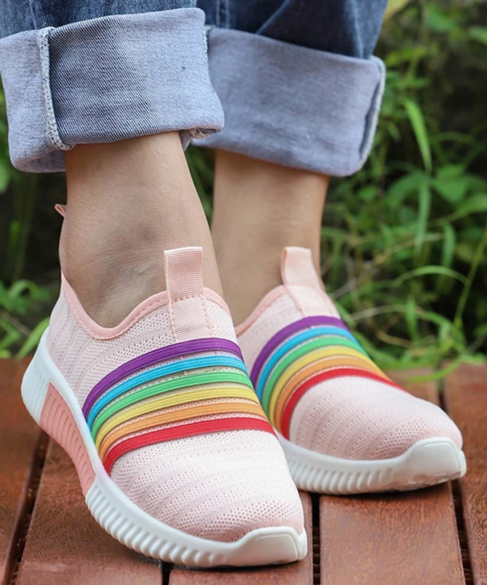 Breathable mesh sock sneakers featuring convenient slip-on style and a bright stripe design.