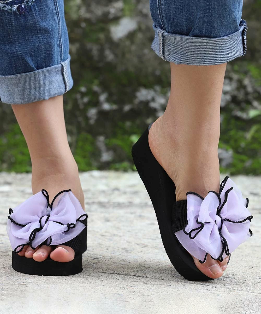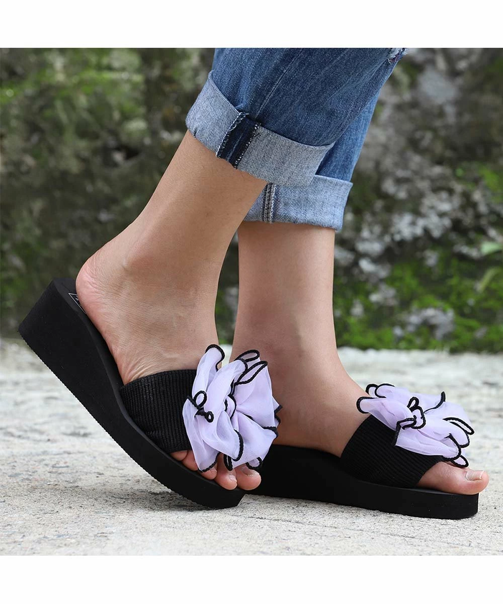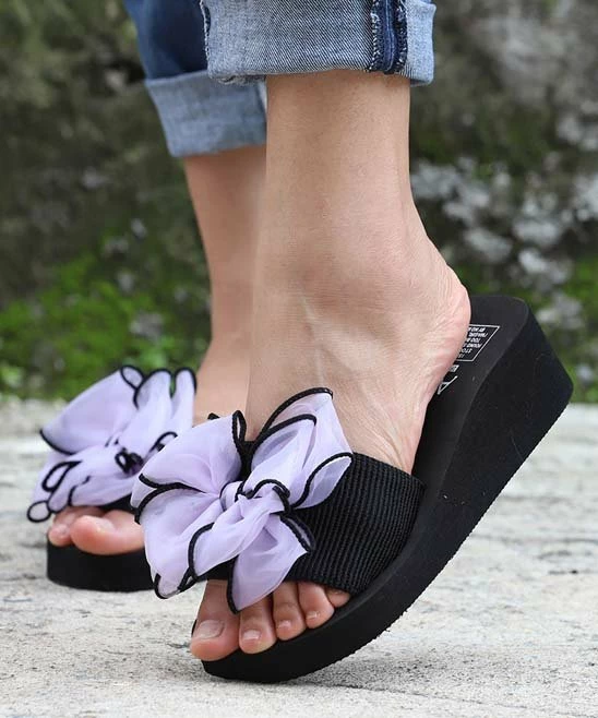 A flouncy bow and a wedge heel add polished appeal to these casual slides making them a match-friendly option for your warm-weather ensembles.