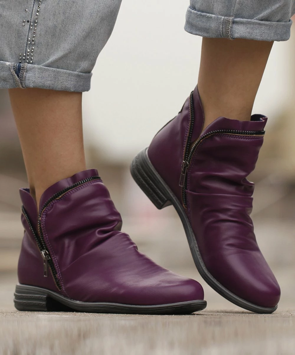 Complete your cool weather ensemble with this pair of ankle boots made with a unique zipper accent and ruched design for a chic style statement.