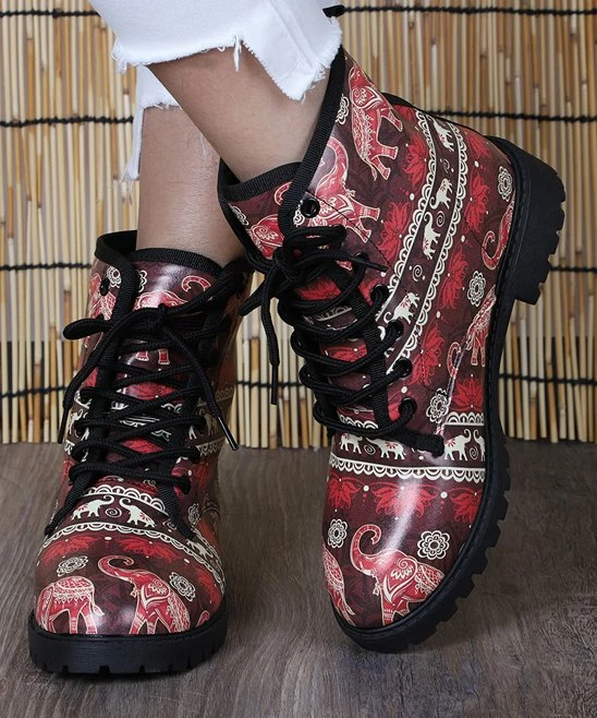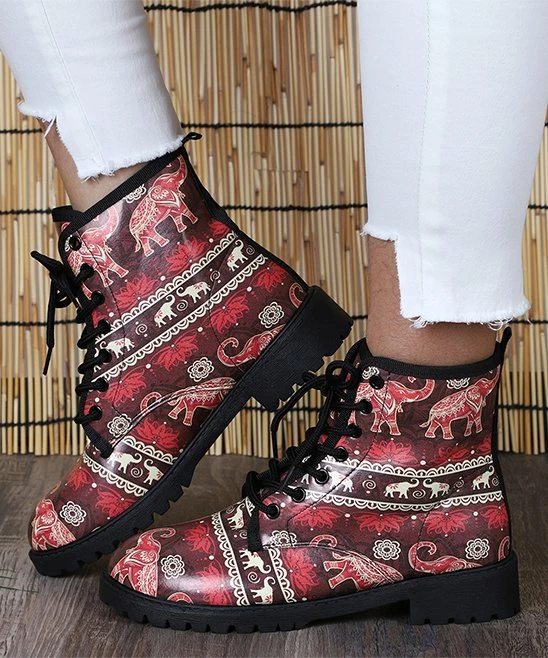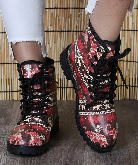 Combat boots featuring a vibrant elephant design and a slightly elevated block heel.