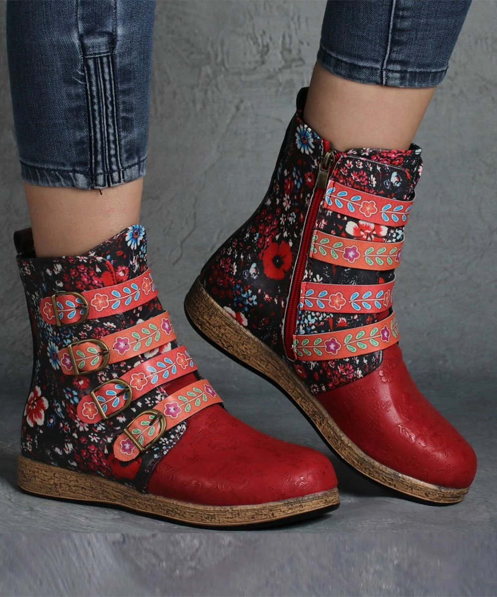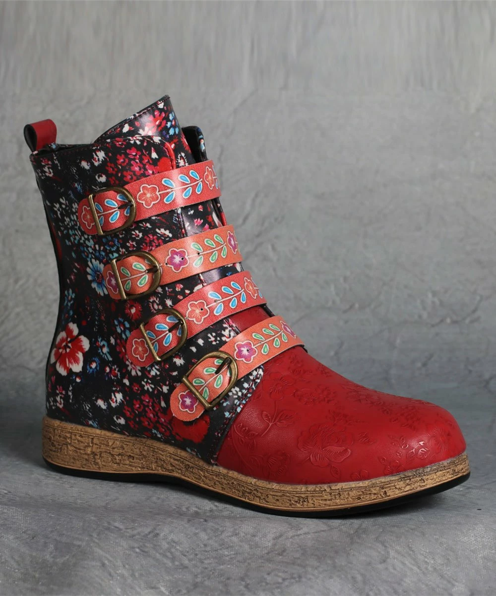 Make your style stand out with this unique bootie boasting intricate floral prints and four slender buckles up the shaft.
