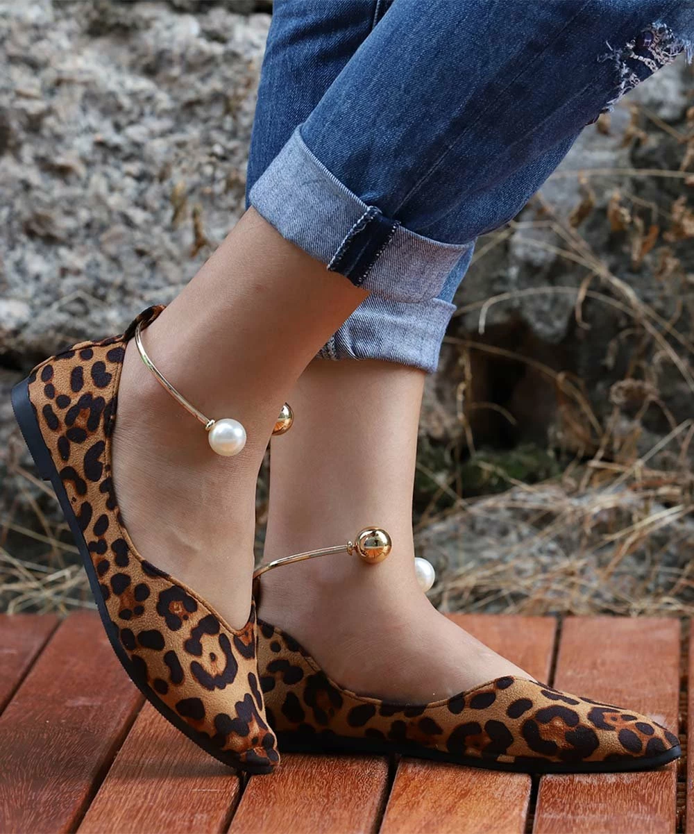 Refine your looks in these pointed-toe flats with a unique ankle strap formed from a goldtone metal band that looks like an anklet.