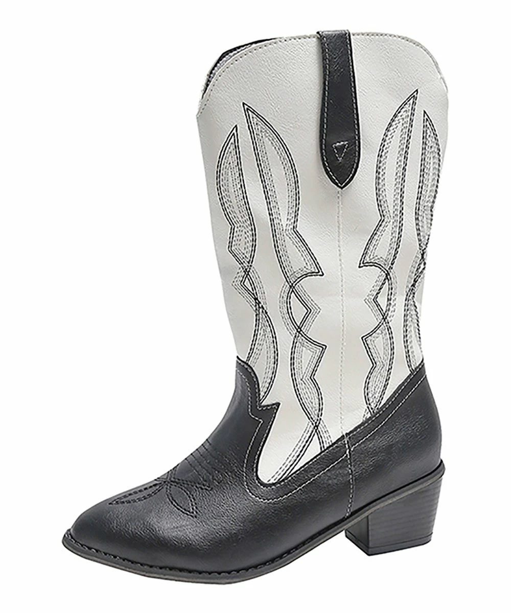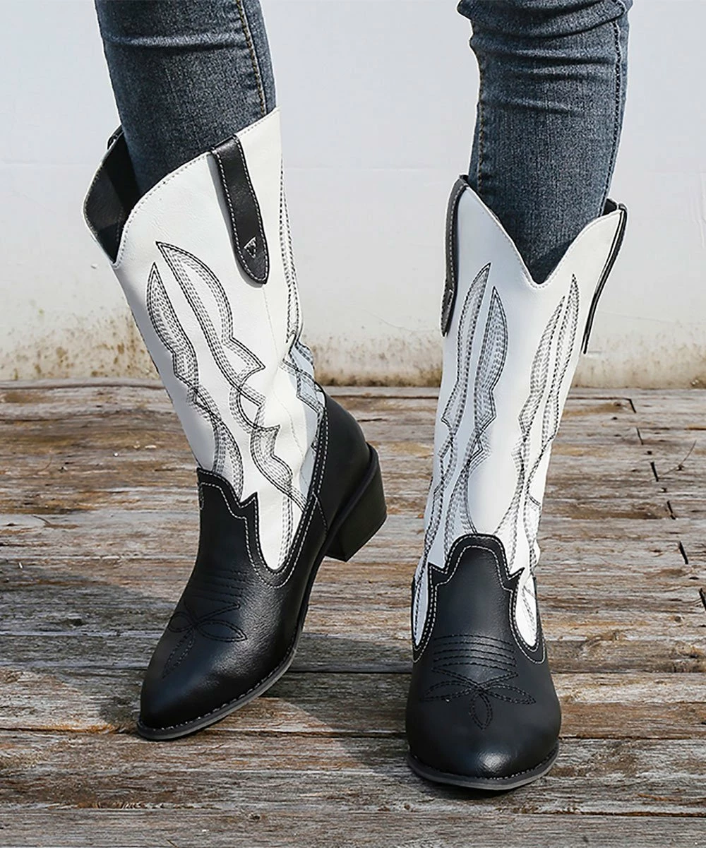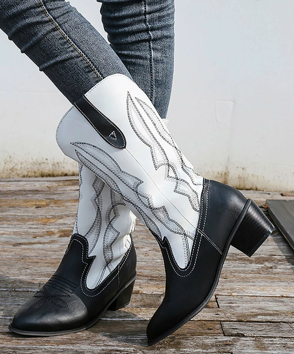 Unique cowboy boots featuring etched detailing and a flexible rubber sole.