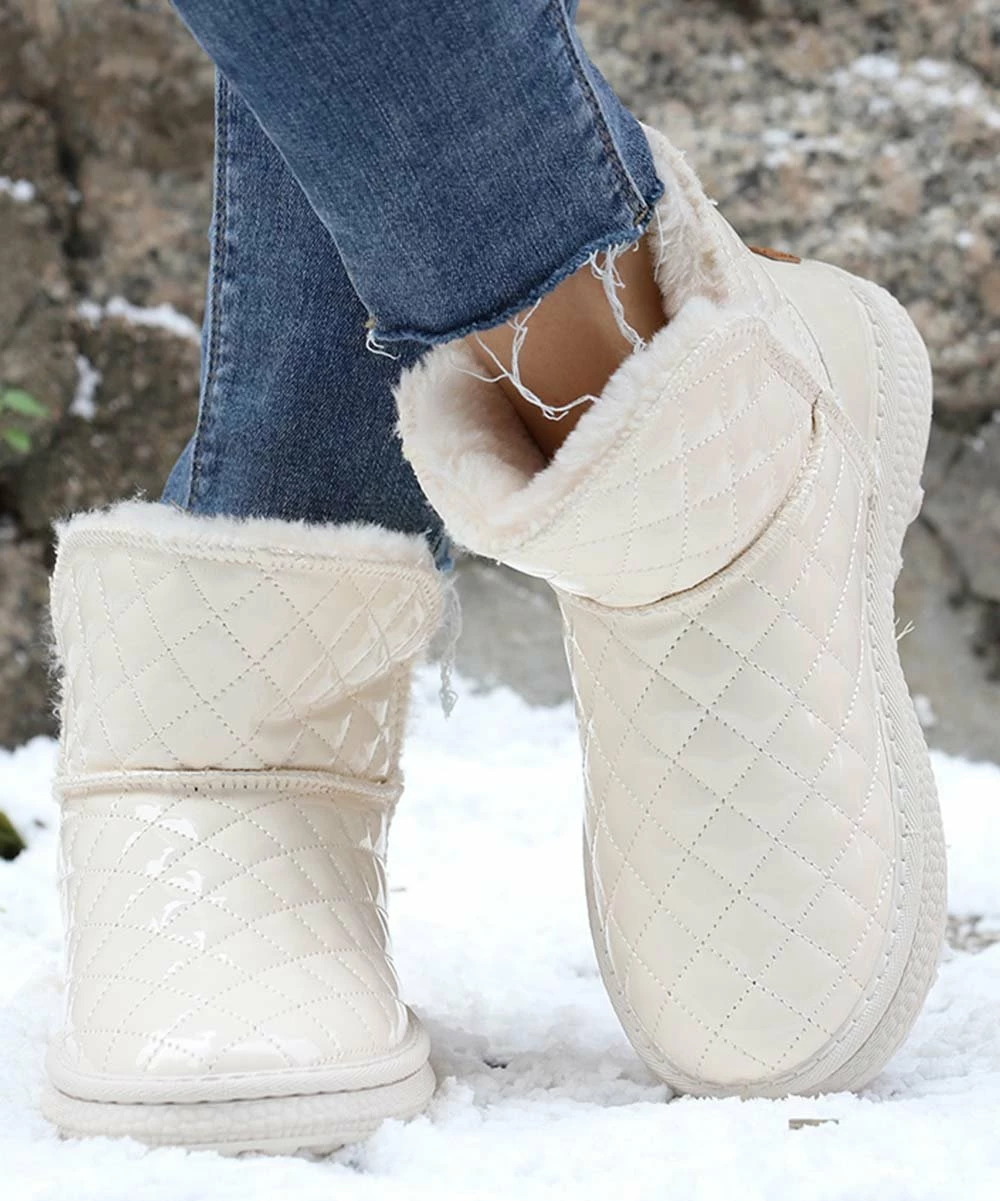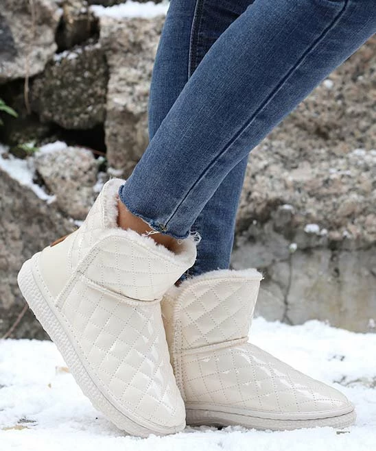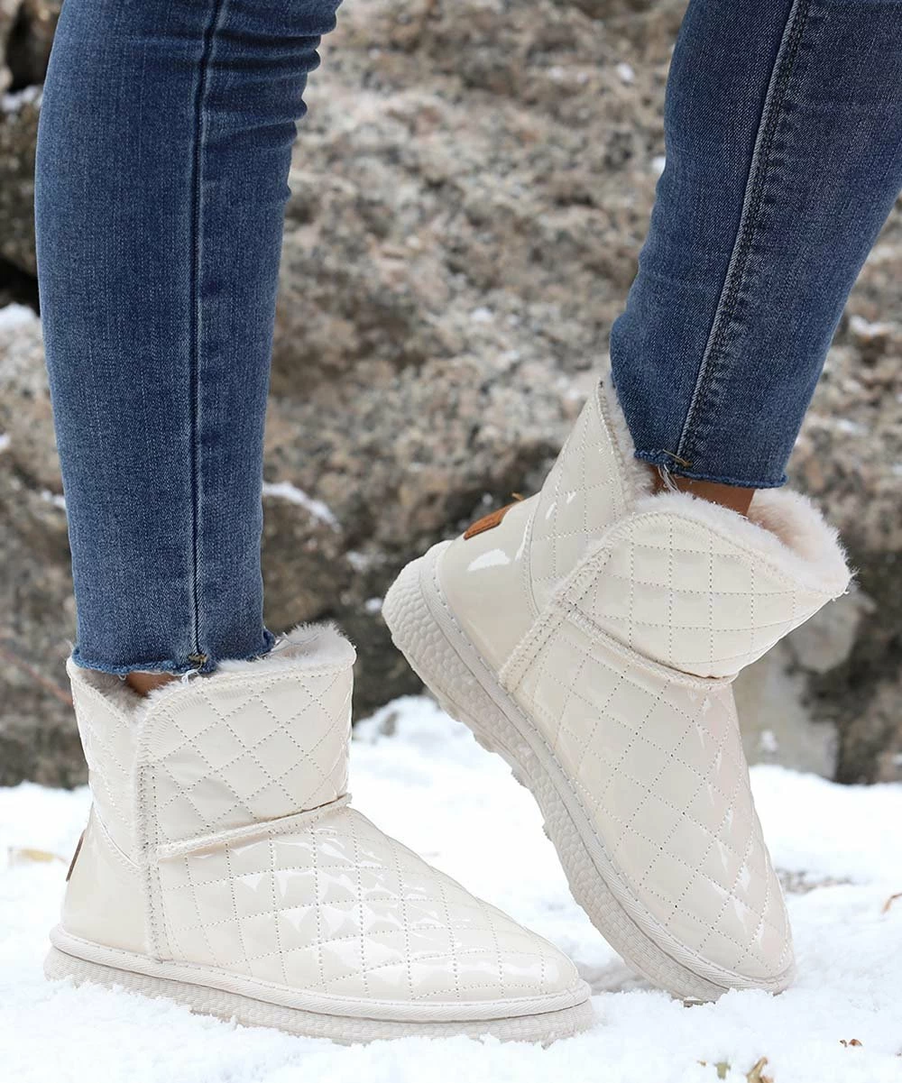 Featuring a glossy, quilted upper and a faux fur lining, this sturdy, lightweight boot highlights a streamlined, rounded shape and faux fur lining for warmth in cold weather.